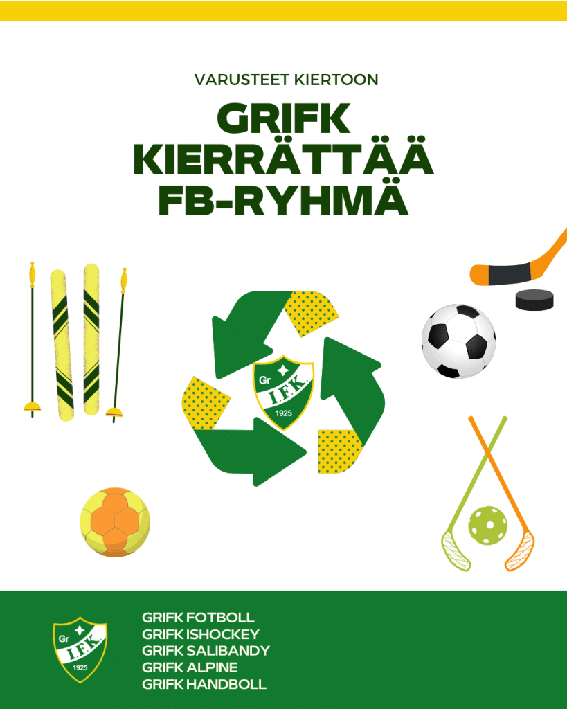 Käytettyjen urheiluvarusteiden ja -vaatteiden osto- ja myyntipaikka on Facebookissa GrIFK Kierrättää –ryhmä.