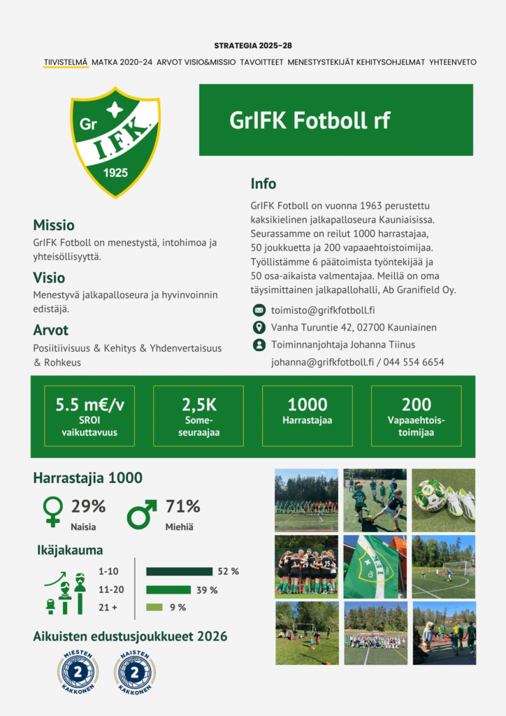 Seura toimii rajatuilla resursseilla ja on aina avoin jäsentensä osaamisen ja kontaktien hyödyntämiseen seuran kehityksen tueksi. Ole rohkeasti yhteydessä toiminnanjohtajaan: johanna@grifkfotboll.fi